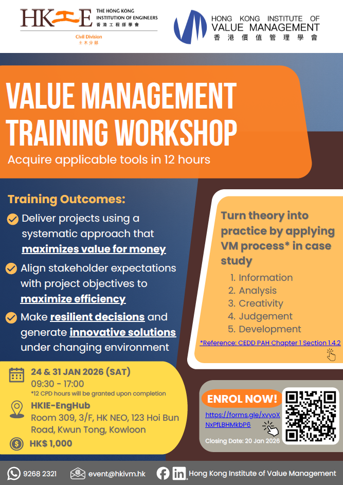Workshop Highlights: Jointly organised by HKIE Civil Division & Hong Kong Institute of Value Management (HKIVM).